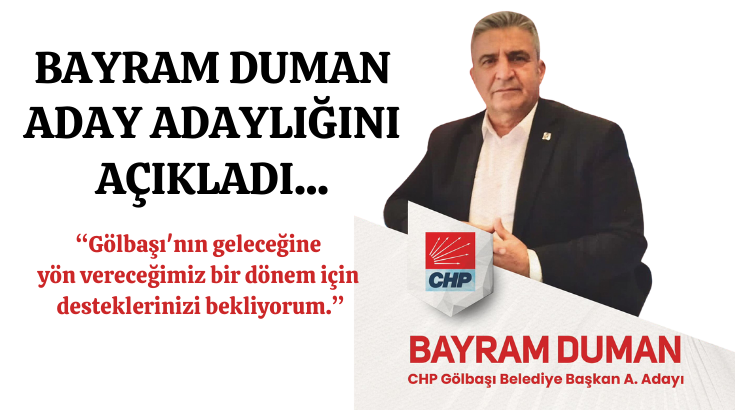 S.M.Mali Müşavir - CHP Gölbaşı Belediye Başkan Aday Adayı Bayram Duman yaptığı aday adaylığı açıklamasında şu ifadeler yer verdi; “Kıymetli Gölbaşılı Hemşehrilerim, Sizlere, Gölbaşı Belediye Başkanlığı için aday adayı olma kararımı duyurmanın gururunu yaşıyorum. Gölbaşı'nın zengin kültürel mirası ve sıcakkanlı insanlarına derin bir bağlılık duyuyorum. Sizlerle birlikte Gölbaşı'nı daha yaşanabilir, daha sürdürülebilir bir yer haline getirmeyi amaçlıyorum. Sosyal ekonomik kalkınma, benim için öncelikli bir konudur. Gölbaşı'nın her kesiminde yaşayan vatandaşlarımızın refah seviyelerini arttırmak, adil bir paylaşım ve destek sağlamak amacımızın temelini oluşturuyor. Girişimcilerimize destek vererek yeni iş olanakları yaratmak, eğitim ve kültür alanlarında projeler geliştirerek gençlerimizin geleceğini güçlendirmek için hep birlikte çalışacağız. Ayrıca, sosyal yardımlar ve destek programları aracılığıyla ihtiyaç sahibi ailelere uzanacak elimizi daha da güçlendireceğiz. Gölbaşı'nın güzelliklerini koruyarak, çevre dostu projelerle kentimizi daha yeşil ve sağlıklı bir yaşam alanına dönüştürmek hedefimizdir. Hep birlikte, Gölbaşı'nın kalbindeki bu güzel değişim yolculuğuna katılarak, birlikte başarabiliriz. Sizlere olan sorumluluğumu en iyi şekilde yerine getireceğimden emin olabilirsiniz. İnsan odaklı, şeffaf ve katılımcı bir yönetim anlayışıyla Gölbaşı'nın geleceğine yön vereceğimiz bir dönem için desteklerinizi bekliyorum. Gölbaşı için birlikte daha güzel yarınlar inşa etmek amacıyla yaşadığım kentte taşın altına elimi koymaya hazırım.” dedi.