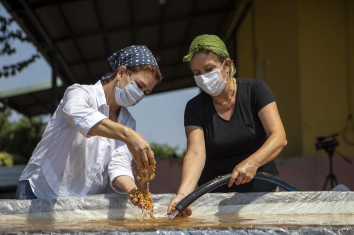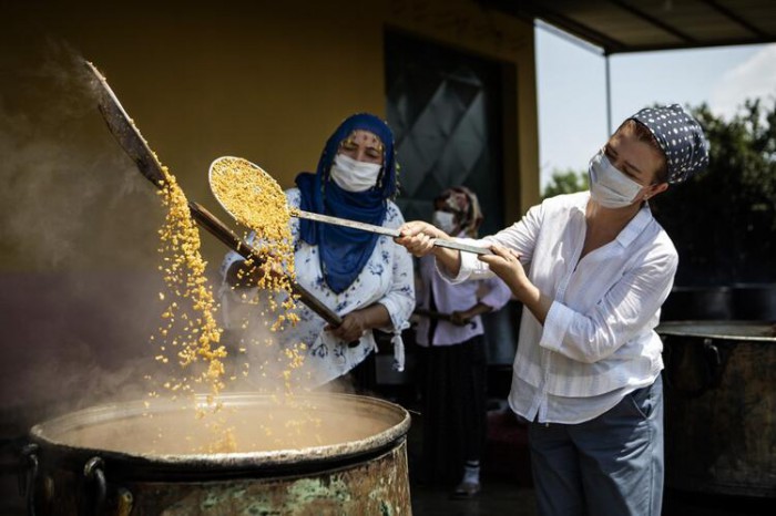 Mersinden Kadın Kooperatifi, Mersin’in Silifke ilçesinde ata mirası tohumdan üretilen sarı buğdayı kazanlarda geleneksel yöntemle kaynatarak, güneşte kurutuyor. İlaçsız ve katkısız üretilen buğdaylar kuruduktan sonra köy değirmeninde öğütülerek bulgur haline getirilip sofralarla buluşacak.