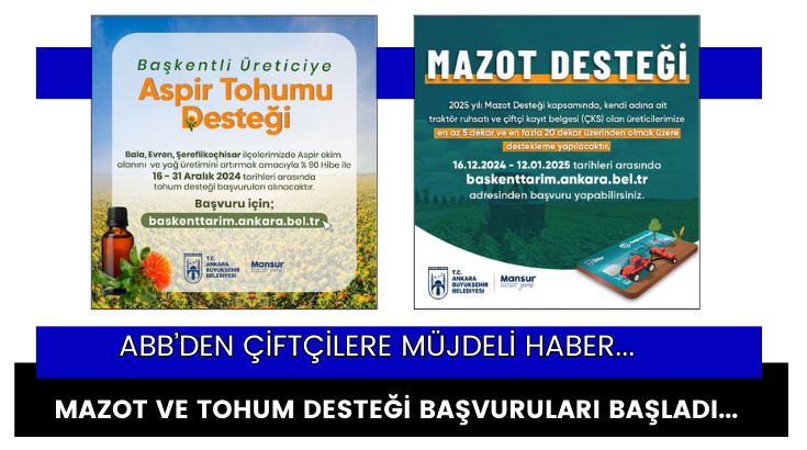 Ankara Büyükşehir Belediyesi üreticilere destek olmaya devam ediyor. Ankara Büyükşehir Belediyesi, üreten çiftçilere yönelik mazot ve aspir tohumu destek başvurularını başlattı.