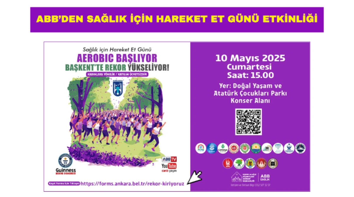 “Sağlık İçin Hareket Et Günü” kapsamında “Aerobik Başlıyor Başkentte Rekor Yükseliyor” sloganıyla düzenlenecek etkinliğe 18-65 yaş arası tüm kadınlar katılabilecek. Katılımın ücretsiz olduğu etkinlik için forms.ankara.bel.tr/rekor-kiriyoruz adresinden başvuru yapılacak.