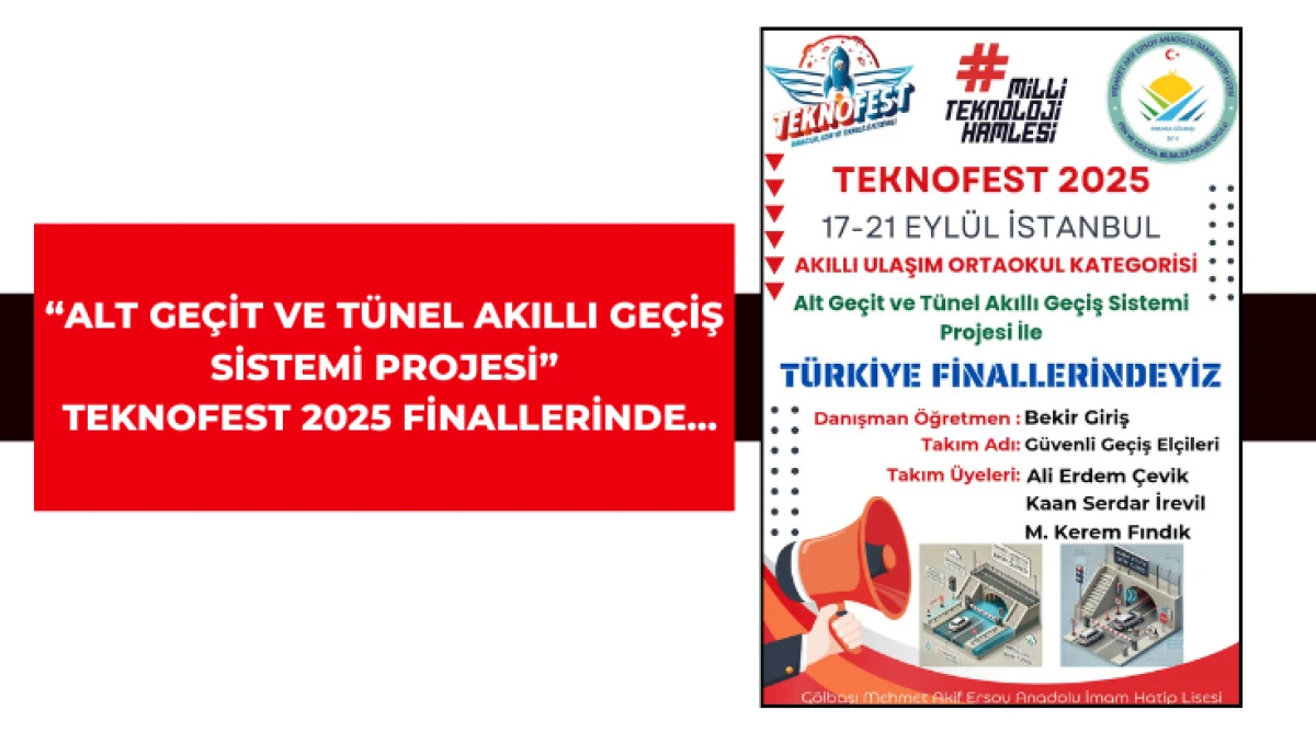 Mehmet Akif Ersoy Anadolu İmam Hatip Lisesi 6/C sınıfı öğrencileri; Ali Erdem Çevik, Kaan Serdar İrevil ve Muhammed Kerem Fındık’tan oluşan “Güvenli Geçiş Elçileri Takımı”, geliştirdikleri Alt Geçit ve Tünel Akıllı Geçiş Sistemi projesiyle büyük bir başarıya imza attı.