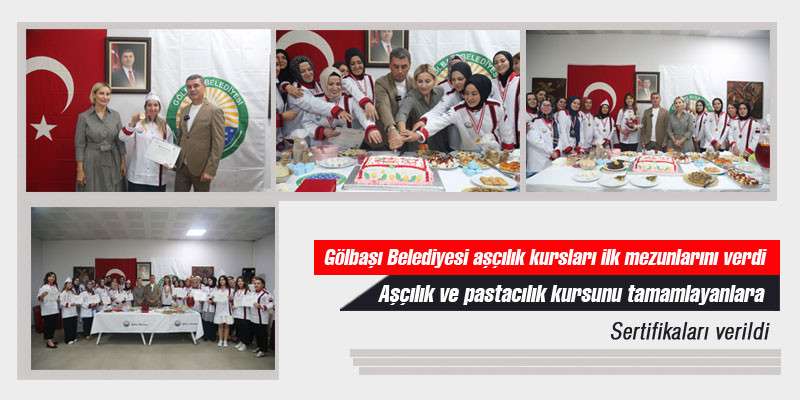 Gölbaşı Belediyesi Zübeyde Hanım Kültür Merkezi’nde alanında uzman, Uluslararası Milli Şef, Kadın Aşçılar ve Pastacılar Federasyon Başkanı Nilgün Okursoy Ulaşır tarafından, Gölbaşı Belediyesi’nin katkılarıyla hem kadınları desteklemek hem de kadın girişimcileri özendirmek amacıyla verilen aşçılık ve pastacılık kursunu başarıyla tamamlayan kursiyerler sertifika almaya hak kazandı. 168 saat süren eğitimin sonunda katılımcılara e-devlet onaylı, devlet üniversitesi olan Fatih Sultan Mehmet Üniversitesi Sürekli Eğitim Merkezi tarafından verilen Geleneksel Türk Mutfağı Eğitimi sertifikalarını ve madalyalarını Gölbaşı Belediye Başkanı Ramazan Şimşek ve eşi Yeşim Şimşek verdi. Başkan Şimşek, kursu başarıyla tamamlayan kursiyerleri tebrik etti.