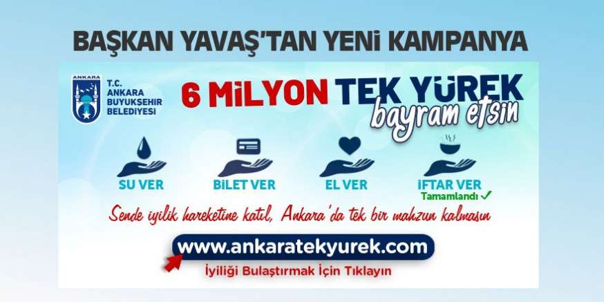 Ankara Büyükşehir Belediyesi Başkanı Mansur Yavaş, “Veresiye Defteri Kapatma” ve “İftar Ver” kampanyasından sonra Ramazan Bayramı için yeni bir kampanya başlattı. “6 milyon tek yürek bayram etsin” kampanyasını Twitter'dan duyuran Yavaş, "Ankara’da her aile bayram etsin, çocukların yüzündeki gülümsemeyle şeker tadında bir bayram olsun istiyoruz" notunu düştü.