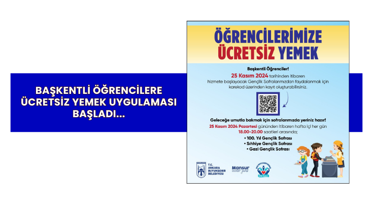 Ankara Büyükşehir Belediye Başkanı Mansur Yavaş, öğrenciler için hayata geçirilecek uygulamayı sosyal medya hesaplarından, “Başkentte geleceğin mimarları gençlerimiz için bir destek daha! Ücretsiz yemek sofralarımızla öğrencilerimize hem sıcak bir yemek hem de bir umut sunuyoruz. 25 Kasım Pazartesi’nden itibaren hafta içi her gün, 18.00-20.00 saatleri arasında buluşalım. Soframızda yeriniz hazır!” notuyla paylaştı.