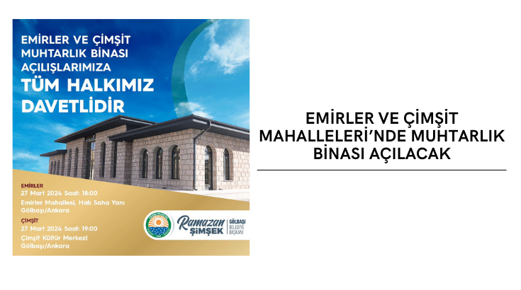 Emirler ve Çimşit Mahalleleri’nde yapımı tamamlanan muhtarlık binalarının açılış töreni bugün arka arkaya yapılacak. Tüm halkın davet edildiği ilk tören Emirler Mahallesi’nde olacak. Emirler Mahallesi Halı Saha Yanı’nda saat 18.00’de yapılacak açılış töreninin ardından Çimşit Mahallesi’ne gidilerek Çimşit Kültür Merkezi’nde saat 19.00’da muhtarlık binası açılış töreni gerçekleşecek.