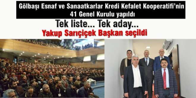 Gölbaşı Esnaf ve Sanaatkarlar Kredi Kefalet Kooperatifi'nin 41. Genel Kurul toplantısı Gölbaşı Belediyesi Mehmet Akif Ersoy Kültür Merkezi'nde çok sayıda esnafın katılımı ile gerçekleşti.   1509 üyesi bulunan Gölbaşı Esnaf  ve Sanaatkarlar Kredi Kefalet Kooperatifi'nin yapılan kongresinde; 1100 üyenin seçim kartı aldığı, seçimin sonuçlanmaması durumunda bu sayının daha da artacağı gözlendi. Divan Başkanlığı'na 2. Bölge Esnaf ve Saanatkarlar Kredi Kefalet Kooperatifi Başkan Yardımcısı ve Kırıkkale Esnaf ve Sanatkarlar Kredi ve Kefalet Kooperatifi Başkanı  Osman Cebeci'nin seçilmesinin ardından gündem maddelerine geçildi. Saygı Duruşu ve İstiklal Marşı'nın okunması sonrası Yönetim ve Denetim Kurulu raporları ibra edildi.  Yeni oluşacak Yönetim Kurulu'na, gayrimenkul ipoteği almaya ve ipoteği fekki yetkisi verilmesi maddeleri onaylandı. Kooperatif'in takibinde bulunan alacakların yeniden yapılandırılması görüşülerek kabul edildi. Divan'ın yönetim kurulu seçimleri için listeleri istemesinin ardından divana tek liste verildi. Başka aday çıkmayınca divanın açık oylama istemi onaylandı ve kabul edildi. Açık oylama sonucunda Yakup Sarıçiçek başkanlığındaki tek liste oylanarak onaylandı.    Kazanan listeyi hazırlayan Başkan Yakup Sarıçiçek " Her zaman olduğu gibi tarafsız ve adil bir yönetim gerçekleştireceğiz. Her esnafımızın yanında, yardımında ve hizmetindeyiz. Bizi kongremizde yalnız bırakmayan tüm üyelerimize ve misafirlerimize teşekkür ederim." dedi.  Gölbaşı Esnaf ve Sanaatkarlar Kredi Kefalet Kooperatifi'nin yeni yönetimi şu isimlerden oluştu.  Yönetim Kurulu Asil Üyeler: Yakup Sarıçiçek, Kadri Oral, Muammer Çelik, Göksel Akbaş, Recep Sadettin Albut,  Yönetim Kurulu Yedek Üyeler: Veysel Gülhan, Yusuf Şahiner, Ertuğrul Koç, Fatih Duran, Üzeyir Şanver,  Denetim Kurulu Asil Üyeler: Yahya Aydın, Mehmet Albakır Denetim  Kurulu Yedek Üyeler: Mehmet Asma, Adnan Alp 2. Bölge Üst Birlik Asil Temsilcileri: Yakup Sarıçiçek, Kadri Oral, Muammer Çelik, Göksel Akbaş 2. Bölge Üst Birlik Yedek  Temsilcileri: Recep Sadettin Albut, Malik Kurtoğlu, Funda Cingöz, Yücel Aksakal