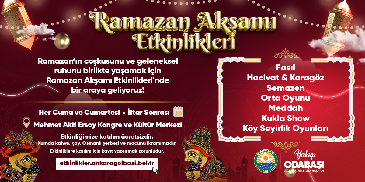 Ramazan ayı boyunca her cuma ve cumartesi günü saat 21.15’te, Mehmet Akif Ersoy Kongre ve Kültür Merkezi’nde düzenlenecek Ramazan Akşamı Etkinlikleri, her yaştan vatandaşa hitap edecek zengin içeriklerle gerçekleştirilecek.