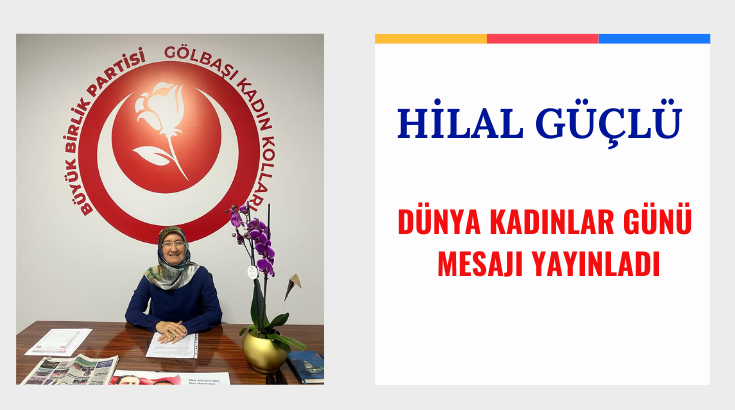 Büyük Birlik Partisi (BBP) Gölbaşı İlçe Kadın Kolları Başkanı Hilal Güçlü; “Kadının elinin değdiği her şey güzelleşir. 8 Mart Dünya Kadınlar Günü Kutlu Olsun” dedi.