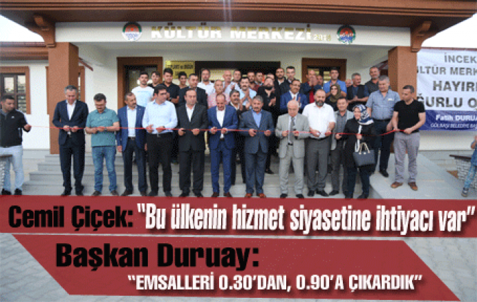 Gölbaşı’nın marka mahallesi olarak olan İncek’e yapılan hizmetlerin sadece Kültür Merkezi ile sınırlı olmadığını ifade eden Duruay, “İncek mahallemize yaptığımız en önemli hizmetlerden birisi de emsallerin 0.30’dan 0.90’a çıkarılmasıdır. Ayrıca halı sahımız ve çocuk parkını da açtık. Bütün bunları seçimden önce İncek’e söz vermiştik sözümü yerine getirmenin ve bu güzel hizmetlerle sizlerle buluşmanın gururunu yaşıyoruz” dedi