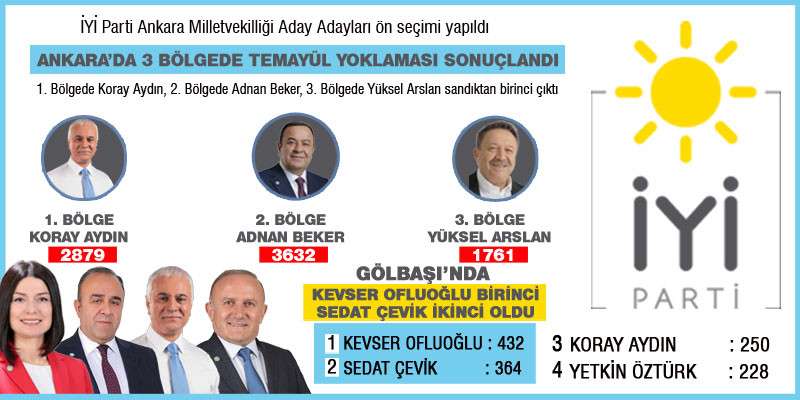 İYİ Parti'de milletvekili adaylığı için Ankara’da yapılan temayül yoklaması sonuçları belli oldu. 1.Bölgede Koray Aydın, 2. Bölgede Adnan Beker, 3.Bölgede Yüksel Arslan sandıktan birinci çıktı. Gölbaşı’nda ise Kevser Ofluoğlu birinci, Sedat Çevik ikinci oldu.