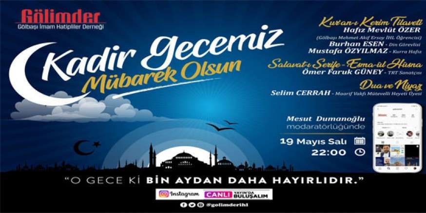 Gölbaşı İmam Hatipliler Derneği tarafından organize edilen Kadir Gecesi canlı yayınında Kuranı Kerim Tilaveti’ni Hafız Mevlüt Özer, Burhan Esen ve Mustafa Özyılmaz, Salavatı Şerife- Esmaül Hüsna Ömer Faruk Güney, Dua ve Niyaz Selim Cerrah tarafından yapılacak. 19 Mayıs Salı günü saat 22.00’de gerçekleşecek ınstagram canlı yayınının modaratörlüğünü Mesut Dumanoğlu yapacak.