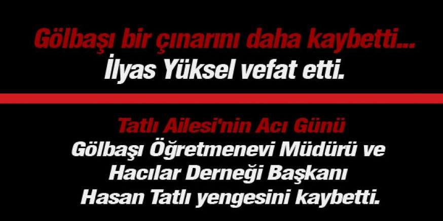 Gölbaşı'nın sevilen aileleriden Yüksel Ailesi babalarını kaybetti. İlçenin köklü ve eski ailelerinden Artvinli Yüksel Ailesi'nin büyüklerinden İlyas Yüksel kalp krizi sonucu hayatını kaybetti. Gölbaşı Spor Kulübü Antrönörü Avni Yüksel, Bülent ve Levent Yüksel'in babası 1933 doğumlu İlyas Yüksel İkindi Namazı'na müteakip Merkez Camiinde kılınacak Cenaze Namazı sonrası Gölbaşı Mezarlığı'nda toprağa verilecek.