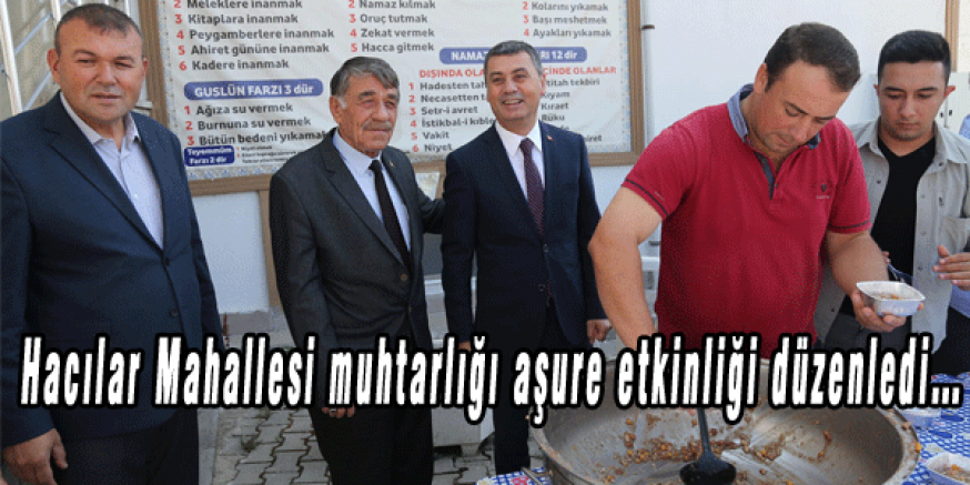 Hacılar Mahallesi’nde Cuma Namazı sonrası Camii cemaati ve mahallelilere aşure ikramında bulunan Hacılar Mahallesi Muhtarı Adem Alp "Dayanışma, birliktelik ve sevginin ifadesi bolluk ve bereketin simgesi olan aşure ikramında bulunduk. Allah kabul etsin". dedi.