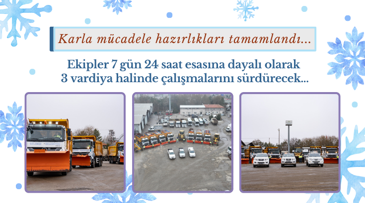 Kış aylarında ilçede olası sorunların önüne geçmek için tüm ekiplerin koordineli bir şekilde çalışacağını belirten Gölbaşı Belediye Başkanı Yakup Odabaşı “ Kış ayları, özellikle kar yağışı ve buzlanma nedeniyle günlük hayatı olumsuz etkileyebiliyor. Ancak Gölbaşı Belediyesi olarak her türlü ihtimali göz önünde bulundurarak hazırlıklarımızı tamamladık. Fen İşleri Müdürlüğümüz, güçlü araç filosu ve deneyimli ekibiyle sahada olacak, kar ve buzlanma ile mücadele konusunda 7/24 esasına göre çalışacak. Amacımız, vatandaşlarımızın olumsuz hava koşullarından en az şekilde etkilenmesini sağlamak ve ulaşımda herhangi bir aksaklık yaşamamak. Bunun için, kar küreme araçları, kamyonlar ve diğer destek araçlarımızla birlikte, kış aylarında meydana gelebilecek her türlü olumsuz duruma karşı hazırlıklı olduğumuzu belirtmek isterim. Ayrıca, tuz ve solüsyon stoku ile de ihtiyaca anında cevap verebileceğiz. Kış aylarında karşılaşılabilecek tüm olumsuzluklara karşı hızlı bir şekilde çözüm üreteceğiz. Bu süreçte, vatandaşlarımızdan da destek bekliyoruz. Özellikle kış koşullarında dikkatli olmaları ve gerektiğinde belediyemizle iletişime geçmeleri büyük önem taşıyor. Gölbaşı Belediyesi olarak, her zaman olduğu gibi vatandaşlarımızın yanında olmaya devam edeceğiz.” şeklinde konuştu.