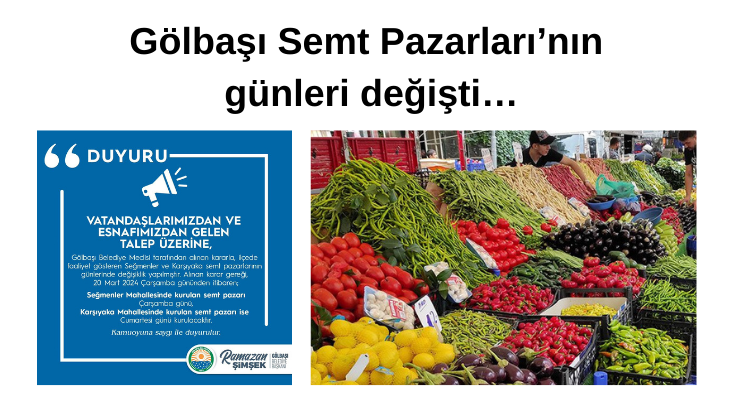 Yoğun talep üzerine Gölbaşı Belediye Meclisi’nde gündeme alınarak ilçede faaliyet gösteren Seğmenler ve Karşıyaka semt pazarlarının günlerinde değişiklik yapıldı.